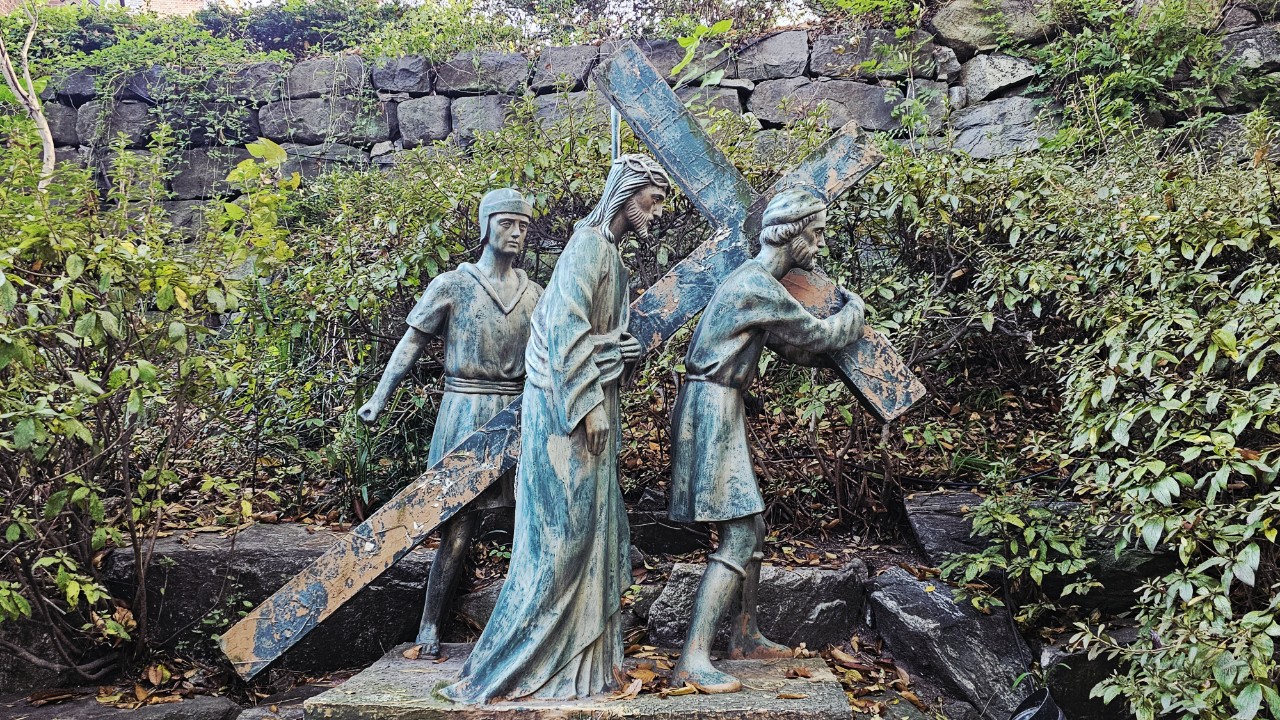 공세리성당 뒤편 언덕으로 이어지는 길에는 '십자가의 길'이 설치되어 있다. '십자가의 길(十四處)'은 예수 그리스도의 수난 여정을 14개의 장면(처)으로 나누어 되새기는 전통적인 가톨릭 신심행위다. 각 처마다 예수의 수난 장면을 입체 조각상으로 표현해 놓았으며, 석조나 청동 작품으로 되어 있어 시대와 신앙의 깊이를 느낄 수 있다.