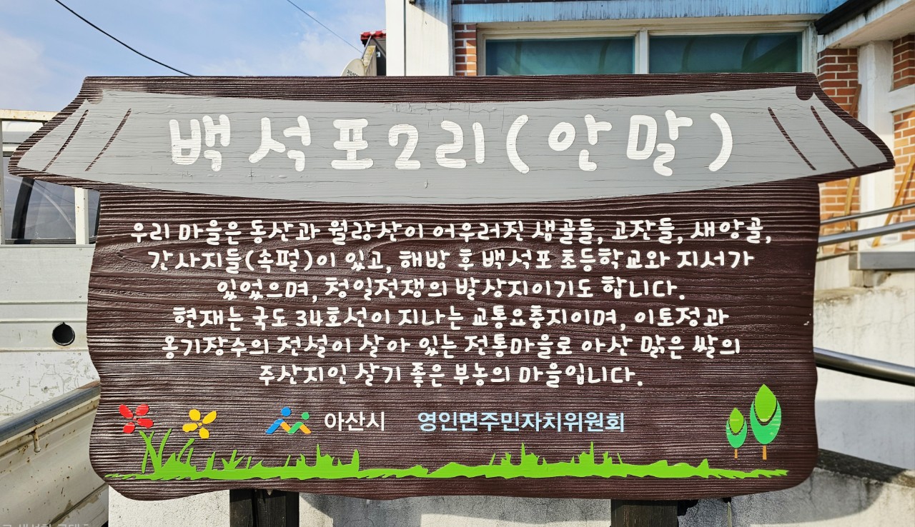 정겨운 시골길을 따라 걷다 보니 백석포마을에 도착한다. 아산시 영인면에 속하는 백석포리(白石浦里)는 예전에는 아산만과 접하여 배가 드나드는 포구마을이었으나, 아산만 댐 조성과 간척 사업으로 많은 농경지가 조성되어 자연스럽게 농촌마을로 변하였다. '백석포리'라는 명칭은 마을에 흰돌이 많아 ‘백석포(白石浦)’라 불리던 것에서 유래하였다.
