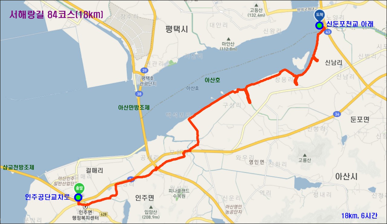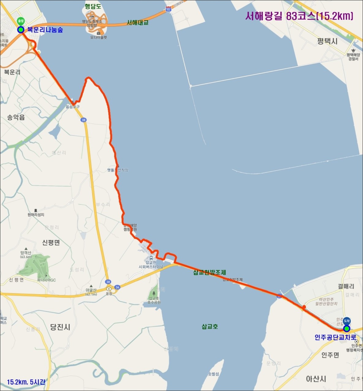 서해랑길 83구간(9.3km) : 인주공단 교차로- (3.5km)-삽교천 방조제-(5.8km)-맷돌포 선착장