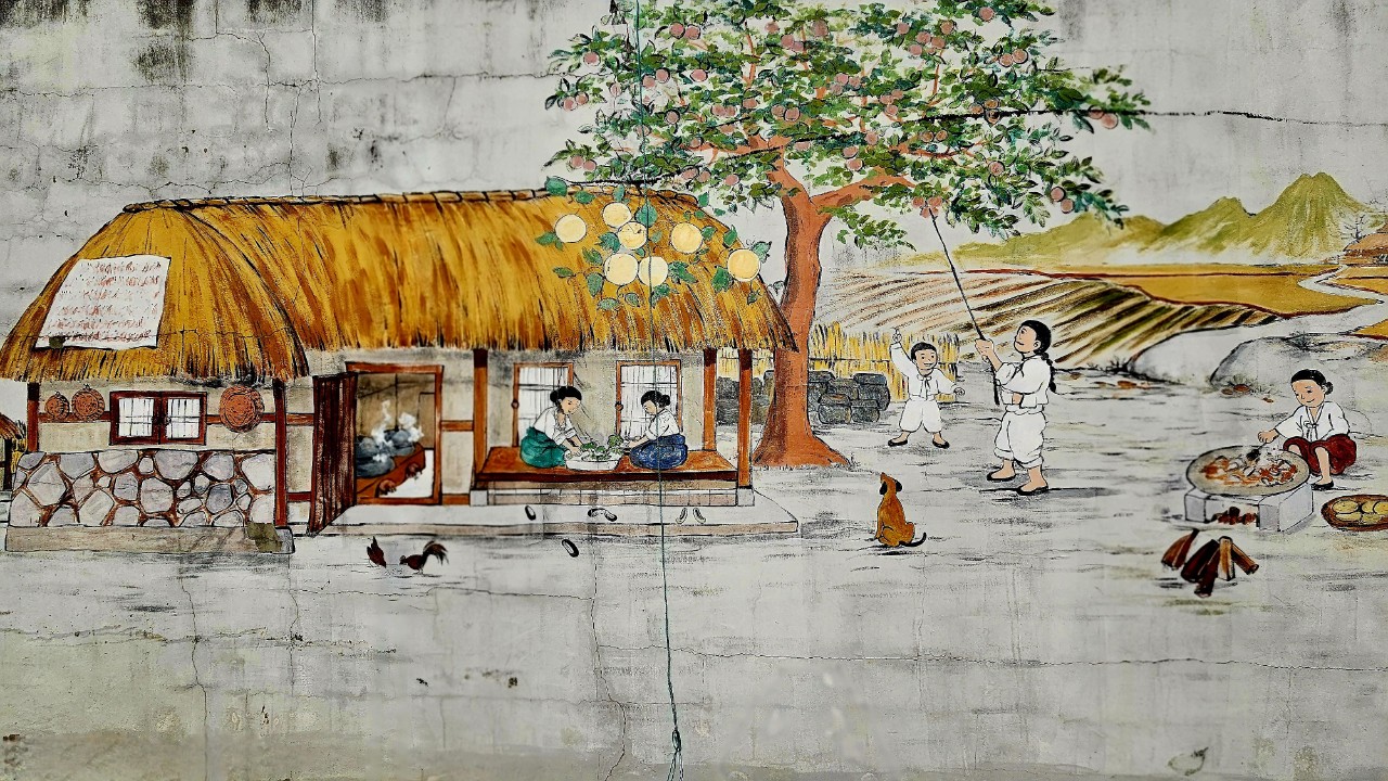 마을 어귀를 지나 걷다 보면, 낡은 담장에 조용히 기대어 있는 농촌 모습의 풍속화가 시선을 끈다. 잠시 발걸음을 멈추고 바라보면, 오래전 잃어버린 마음의 고향이 문득 가까이 다가오는 듯해 따스한 미소가 절로 번진다. 붓질이 투박하지만, 정겨운 표정들이 하나둘 펼쳐지며, 마치 이곳에서 살았던 누군가의 이야기들이 담장 위에 고스란히 남아 있는 듯하다. 그림은 세월의 먼지까지도 풍경의 일부처럼 포근하게 품어낸다.