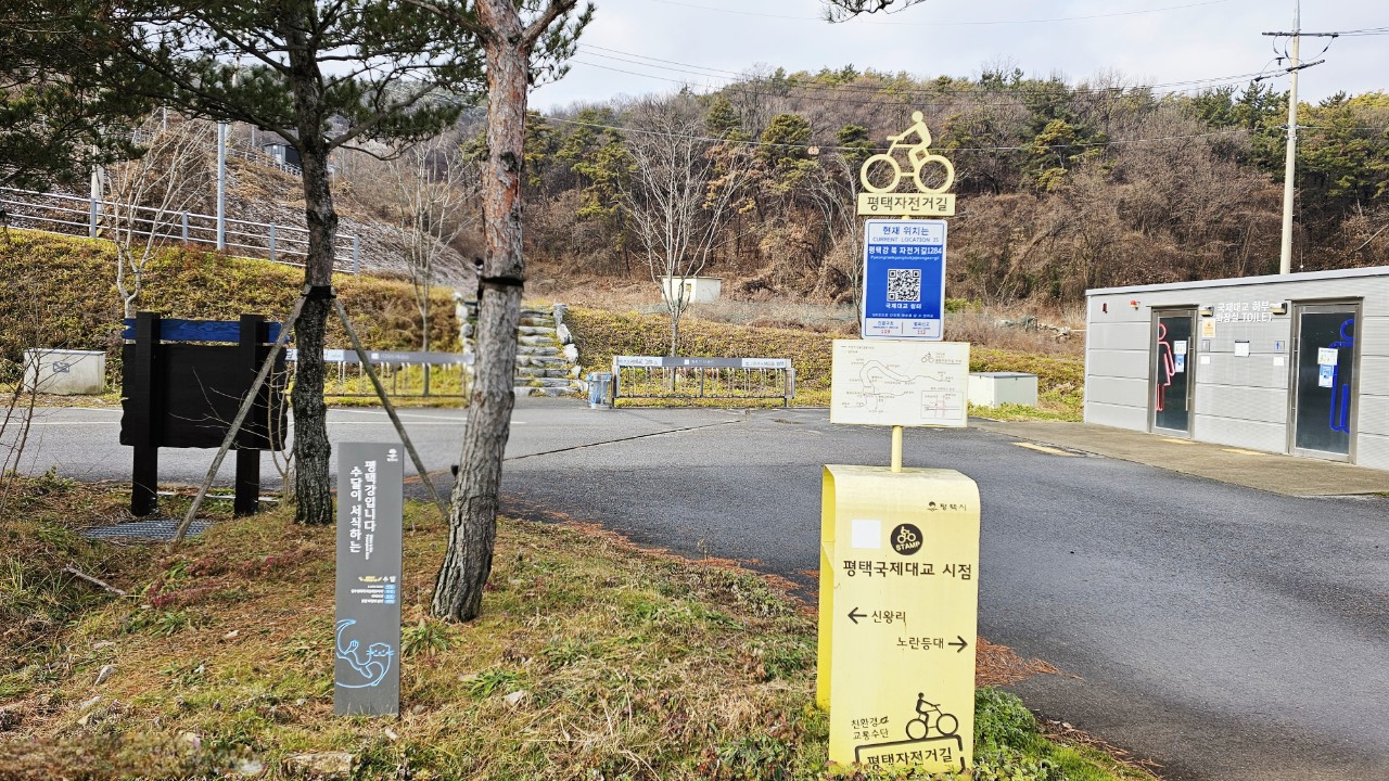 길은 신왕 터널 옆으로 이어지는 길을 따라 평택국제대교 밑을 통과한다. 평택국제대교 서단 밑에는 주차장과 화장실이 있다.