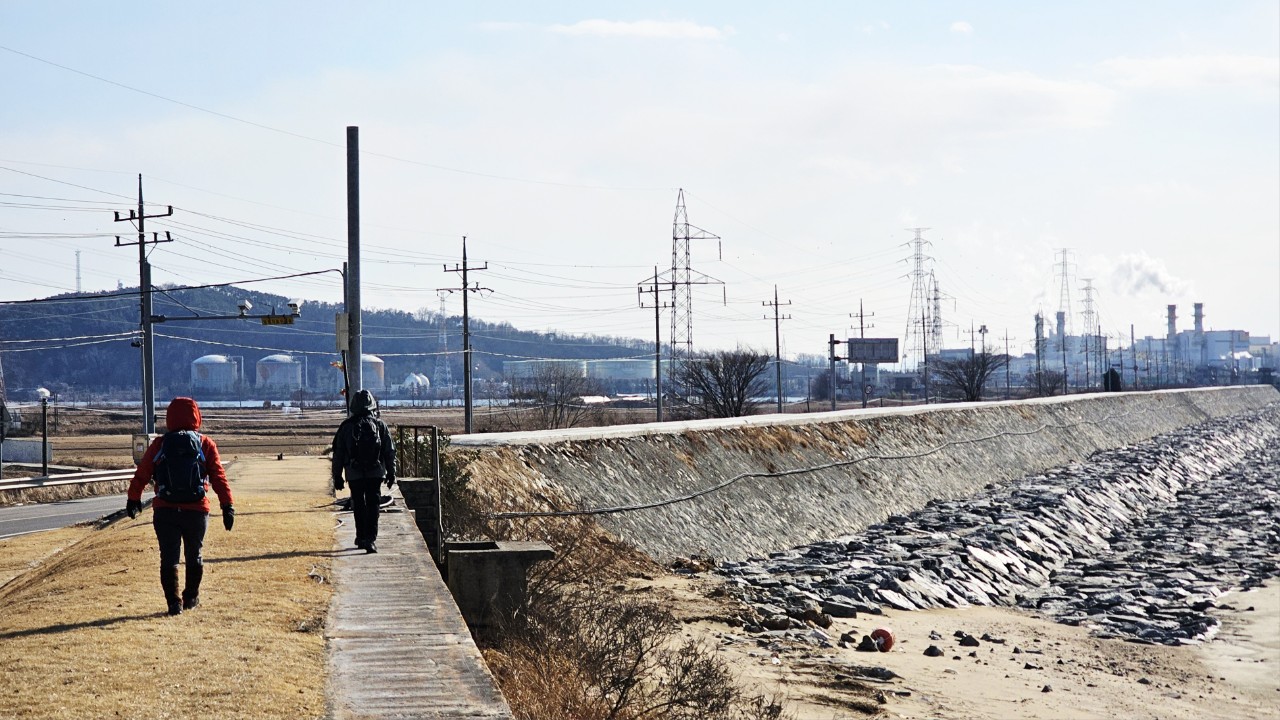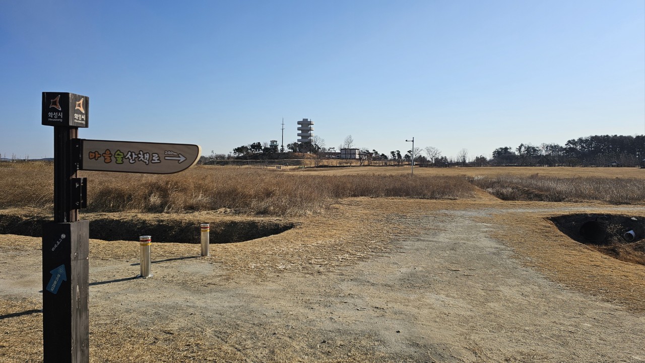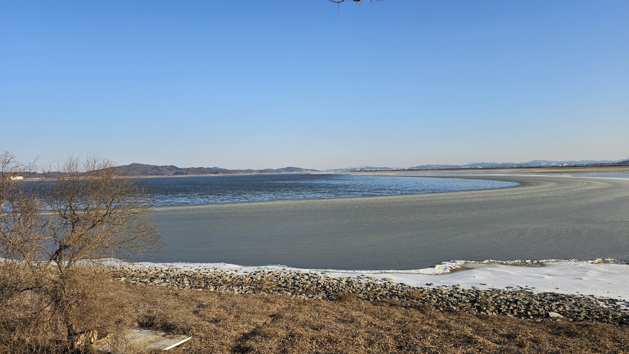 궁평항에서 시작하기엔 거리의 부담이 있어, 화성방조제 중간지점의 이동통신 안테나 앞에서 길을 시작한다. 버스에서 내리자마자 눈앞에 펼쳐진 것은 얼어붙은 화성호수. 겨울이 만든 고요한 수면 위로 스며드는 빛이 묘한 매력을 자아낸다. 차가운 풍경 속에서도 이상하게 마음은 차분해진다.