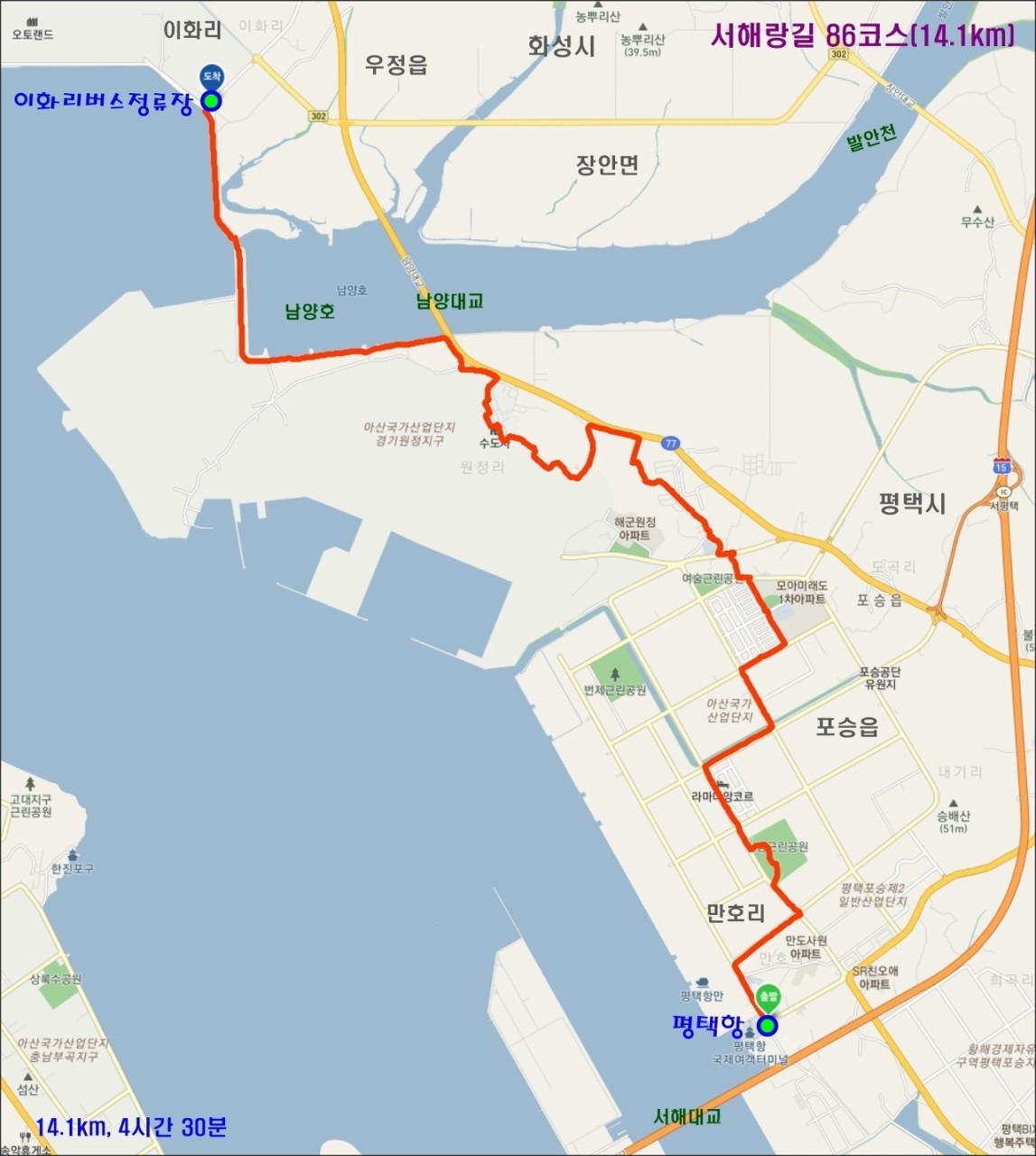 서해랑길 86구간(8.0km) : 이화리 정류장-(1.8km)-남양방조제-(4km)-수도사-(2.2km)-원정초등학교