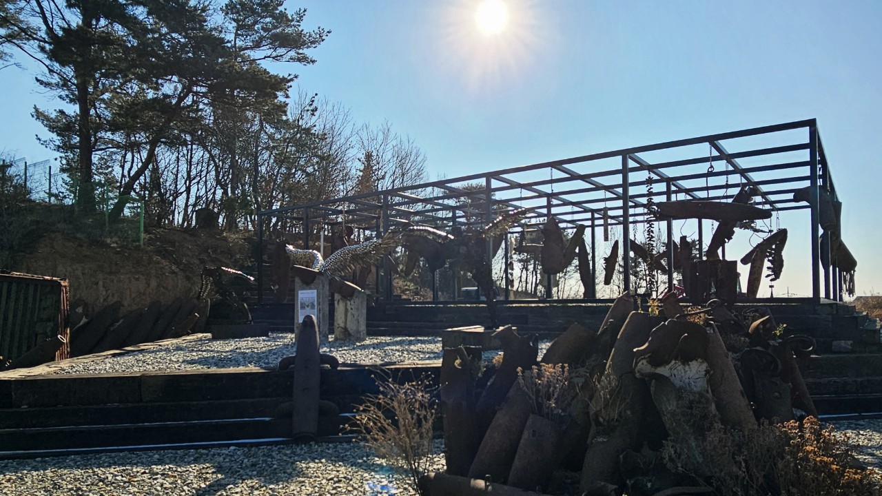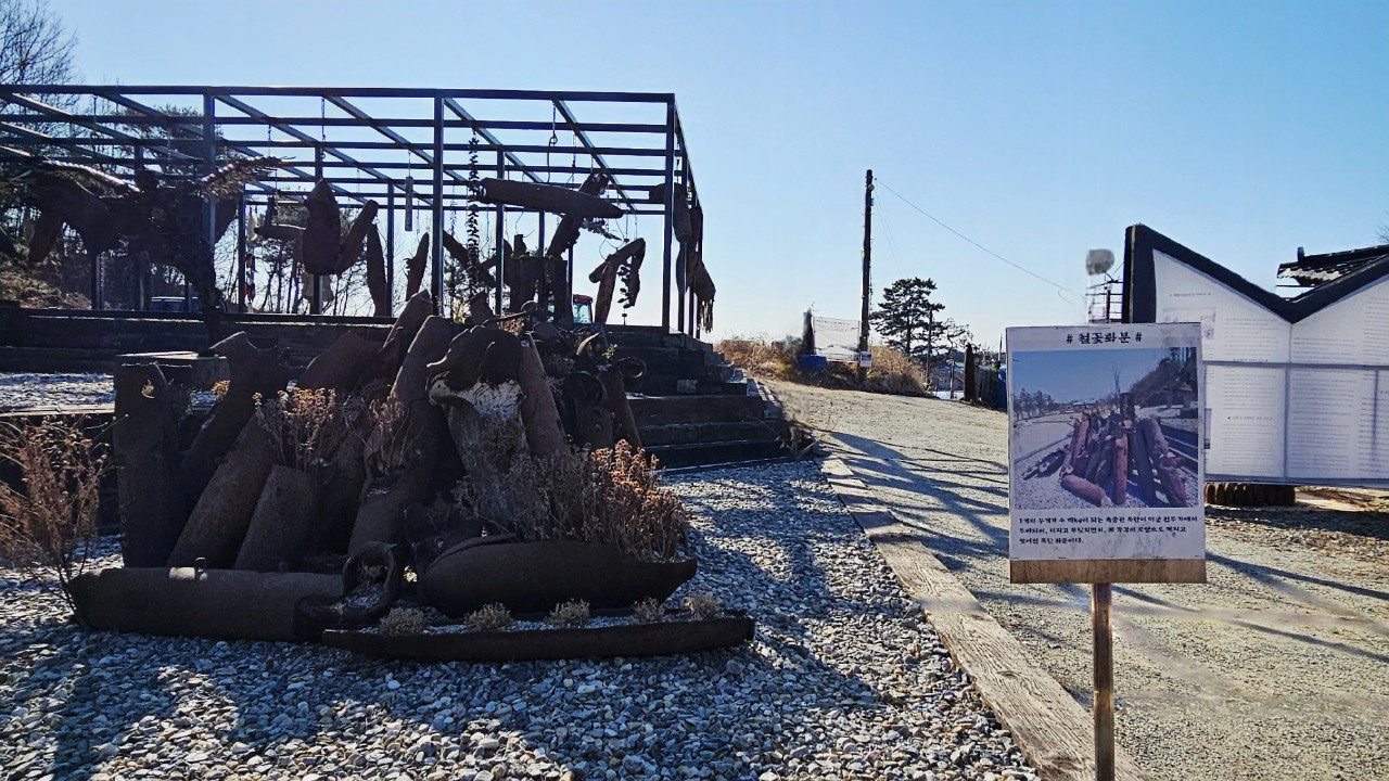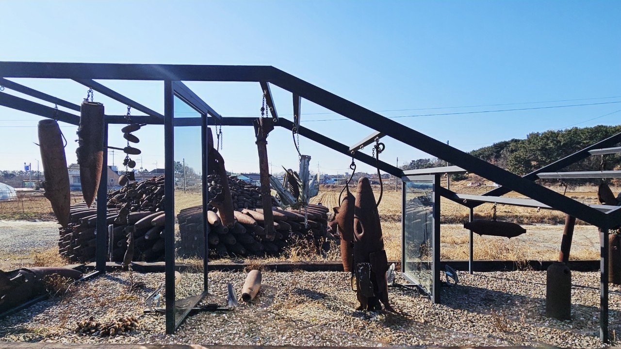 철꽃 화분은 폭탄으로 만들어진 화분이다. 이곳에 어울리는 상징이라는 생각이 든다. 포탄과 탄피, 철제 구조물로 가득했던 매향리에서, 철은 파괴의 재료였다. 그 철이 이제는 꽃의 형태로 다시 태어나 화분이 되었다. 생명을 흉내 내는 철꽃은 역설적이게도 회복과 재생을 말한다. 상처 입은 땅 위에서도, 평화는 이렇게 피어날 수 있다는 조심스러운 선언처럼 보인다.