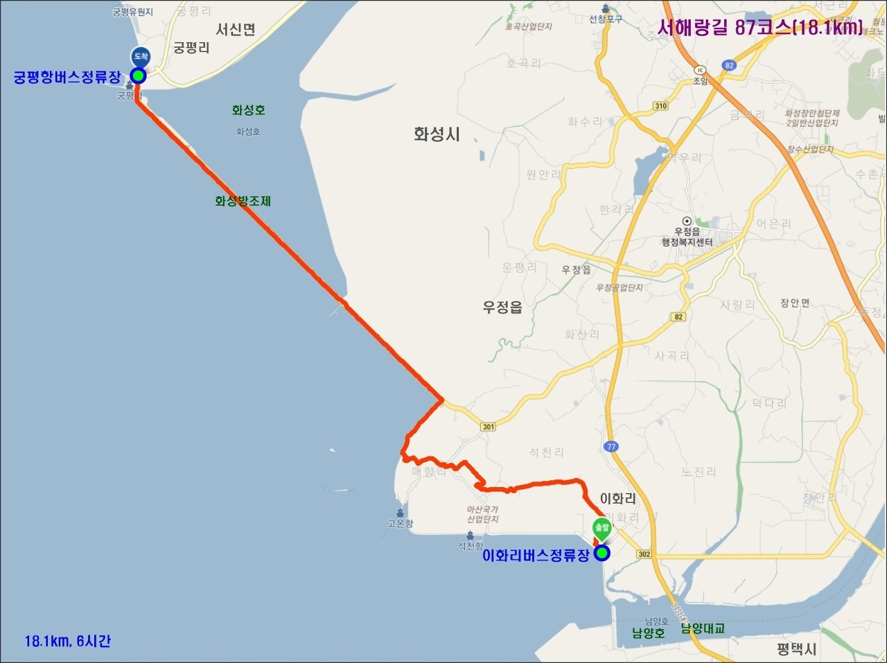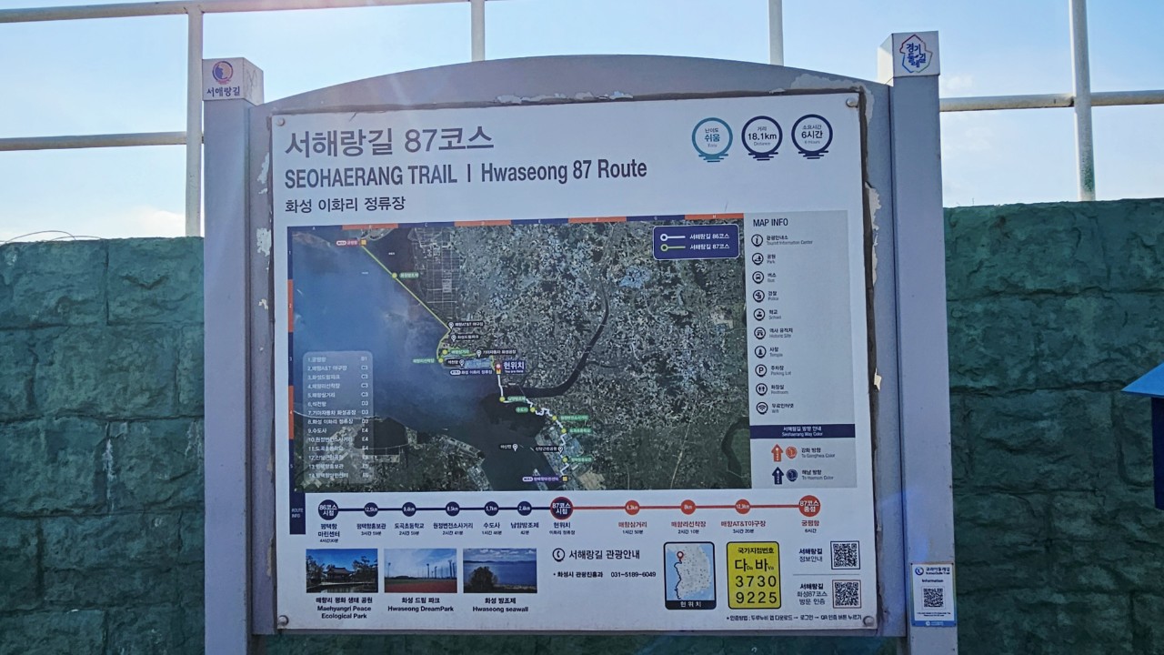 서해랑길 87구간(14.6km) : 화성방조제 중간 지점 이동통신 안테나-(3km)-매향 선착장-(5.6km)-매향리 생태공원-(3km)-기아 모터스-(3km)-이화리 정류장