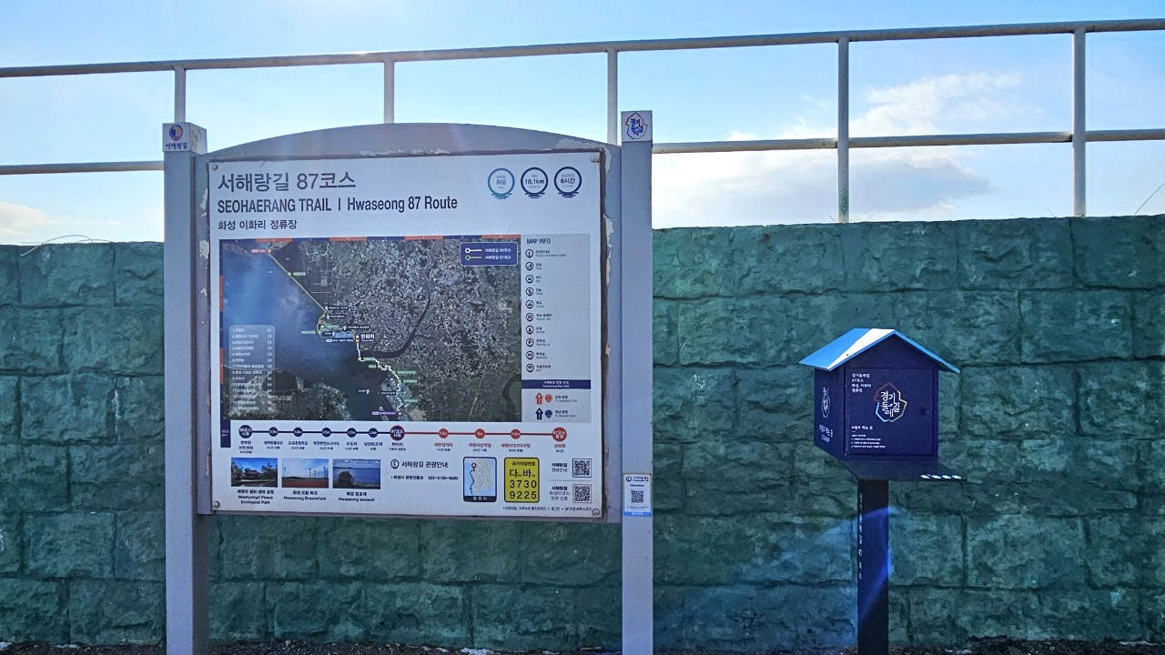 화성 이화리 정류장이 서해랑길 86코스의 종점이자 87코스의 시작점이다. 서해랑길 87코스 안내판 앞에서 기념사진을 남기고, 86코스로 이어간다.