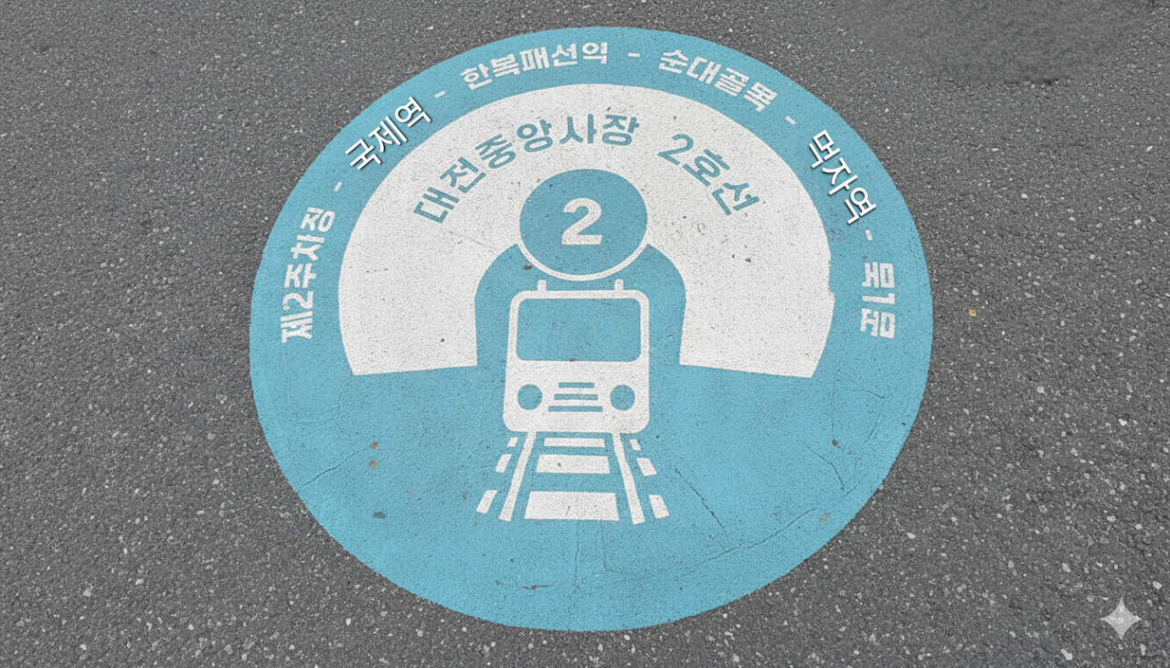 대전 중앙시장 2호선은 제2주차장 앞 남쪽 13GATE로 진입하여 북쪽방향으로 향한다.