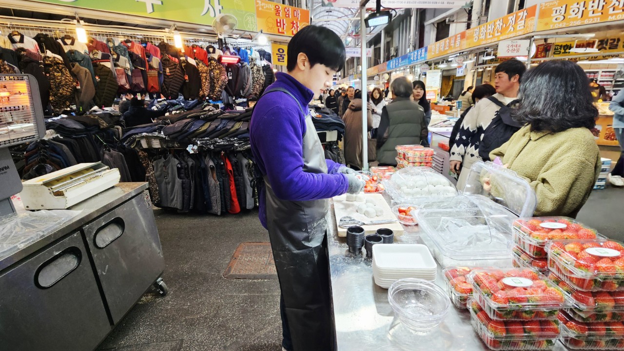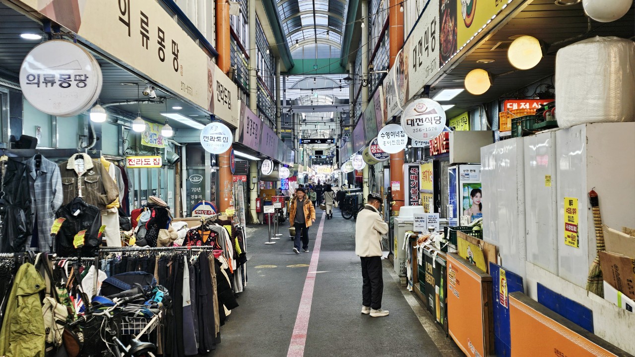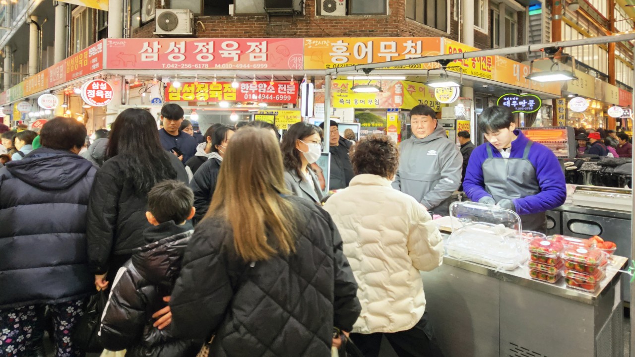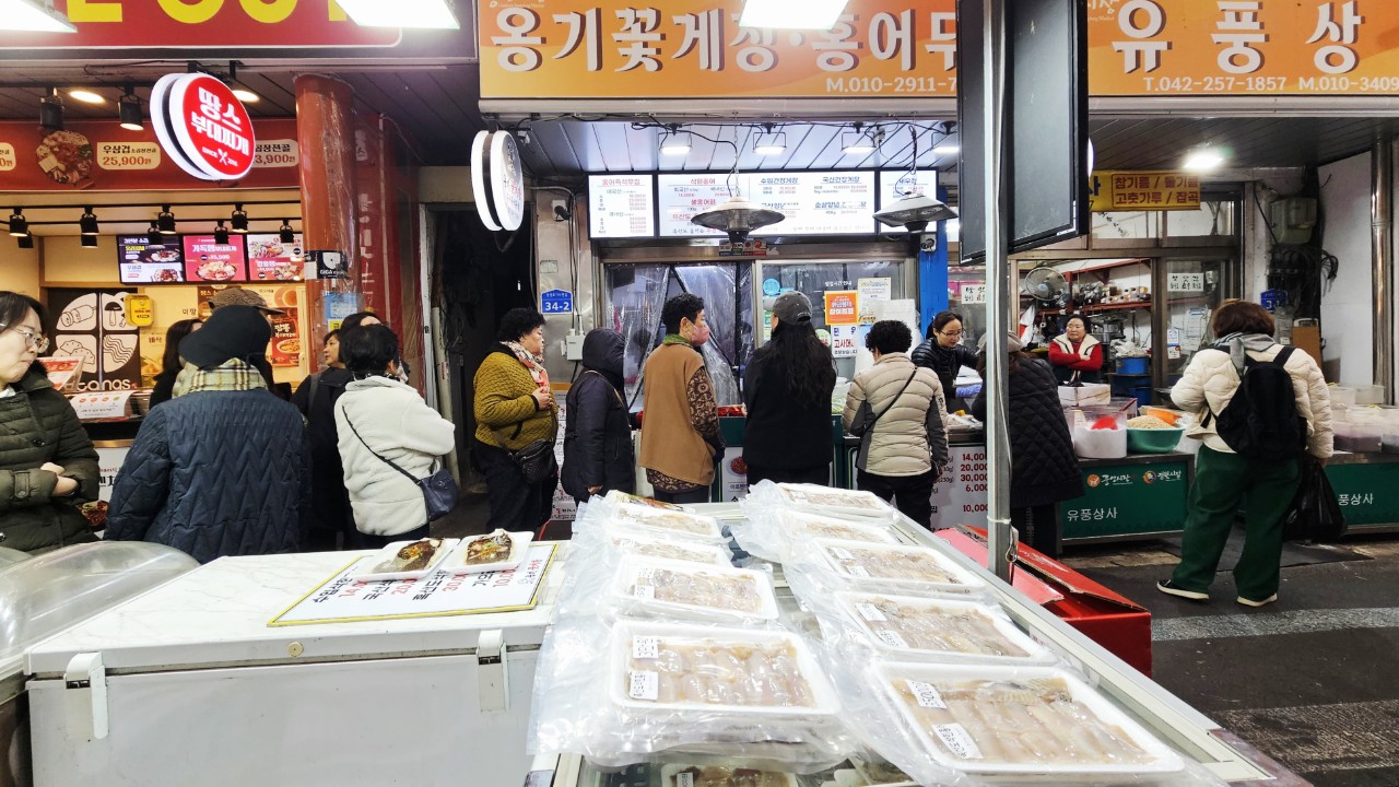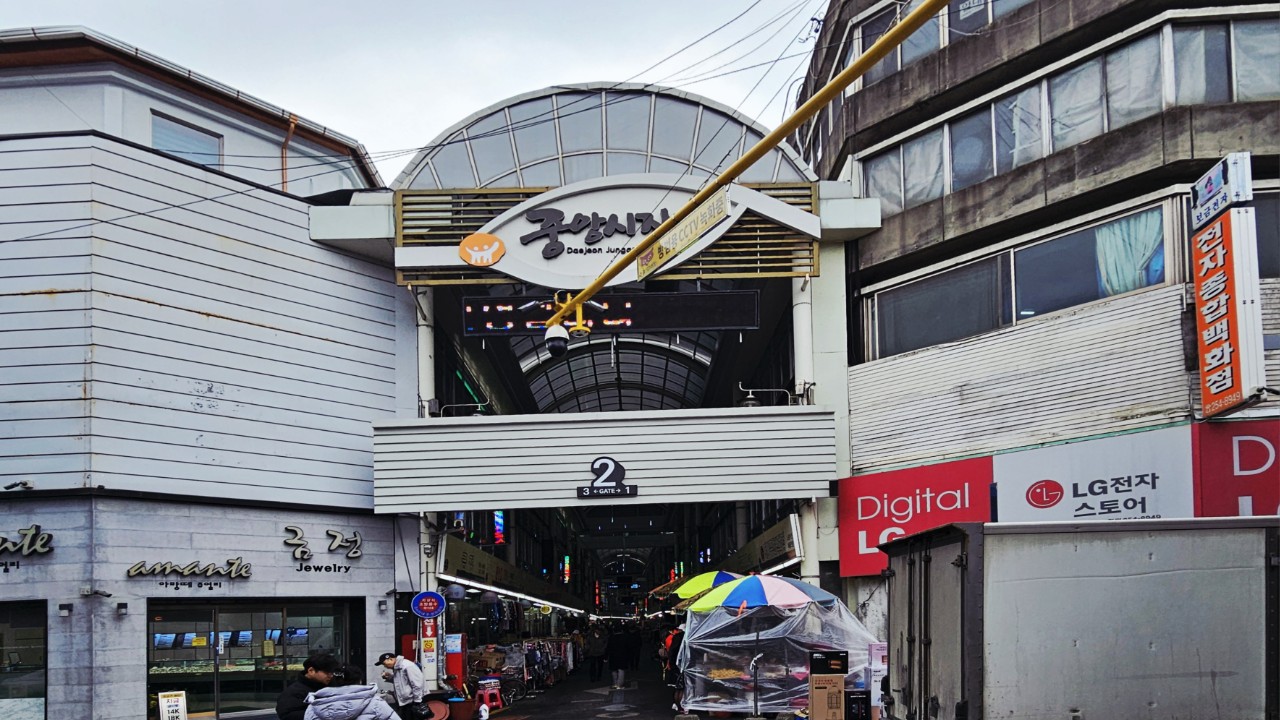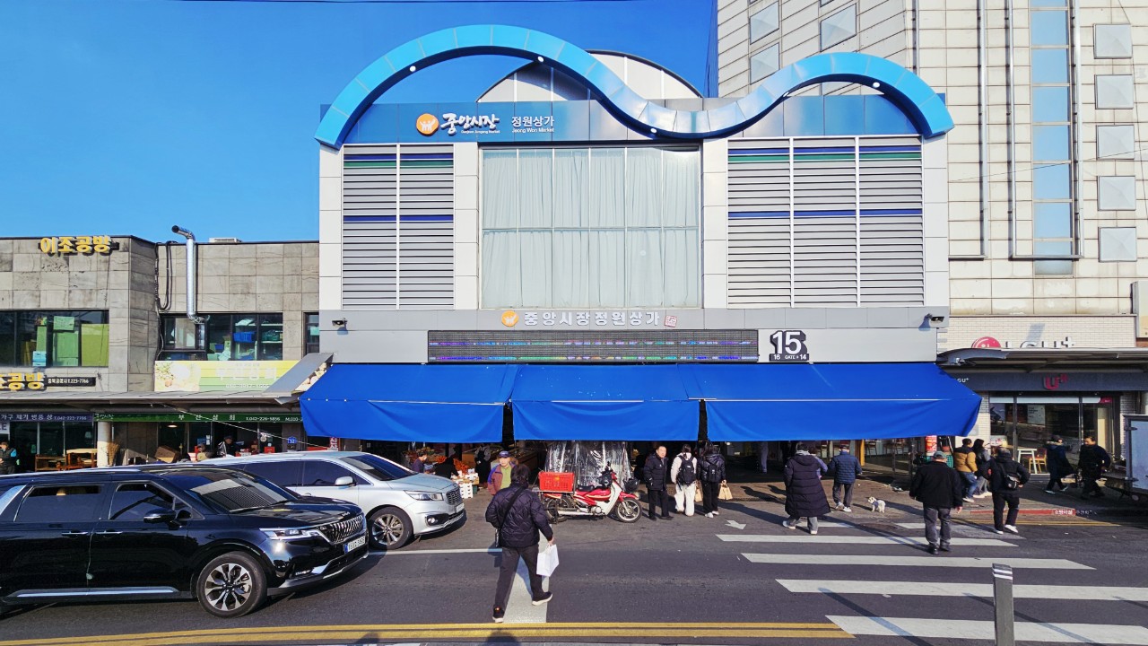 대전중앙시장 특유의 활기찬 골목 풍경이 펼쳐진다. 주변 점포들 사이에 좌판들이 이어지고, 사람들의 오가는 소리와 웃음소리가 뒤섞여 시장 특유의 살아 있는 온기를 전한다. 화려하지는 않지만, 소박해서 더 편안한 거리다.