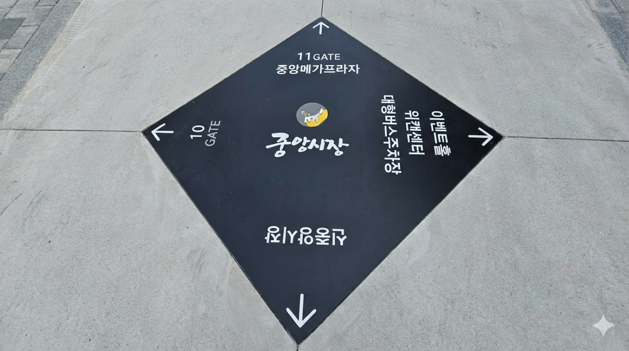 왼쪽은 4호선의 시작점인 동쪽 5GATE로 연결되고, 오른쪽은 정원상가와 생선골목으로 이어진다.