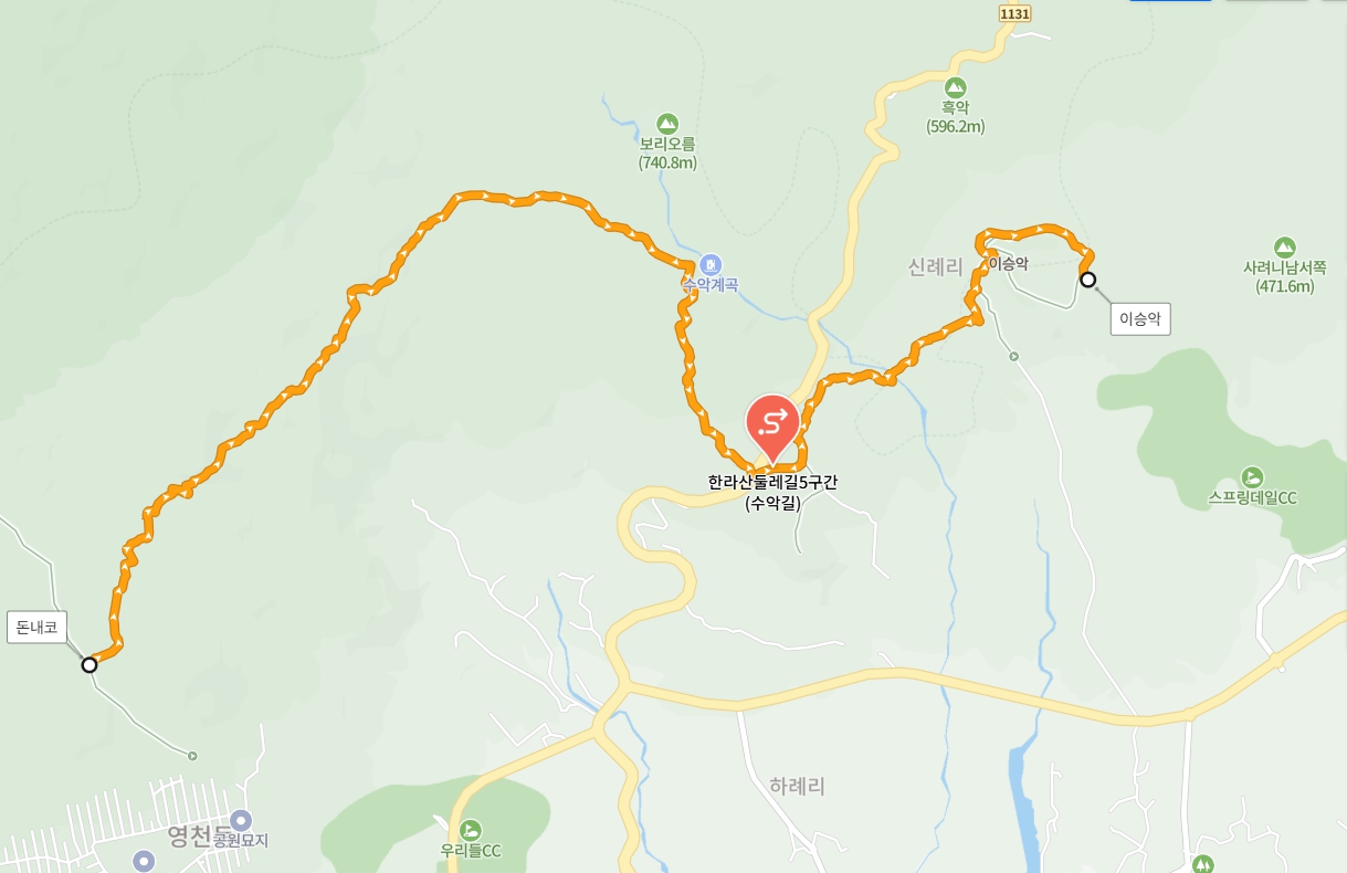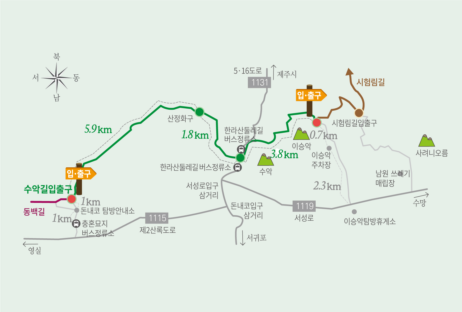수악길은 한라산 남사면의 숲과 오름 지형을 함께 느낄 수 있는 코스로, 걷는 내내 길의 표정이 조금씩 달라진다. 이 구간 주변에는 물오름(수악), 보리오름, 이승이오름 등이 분포해 있다.