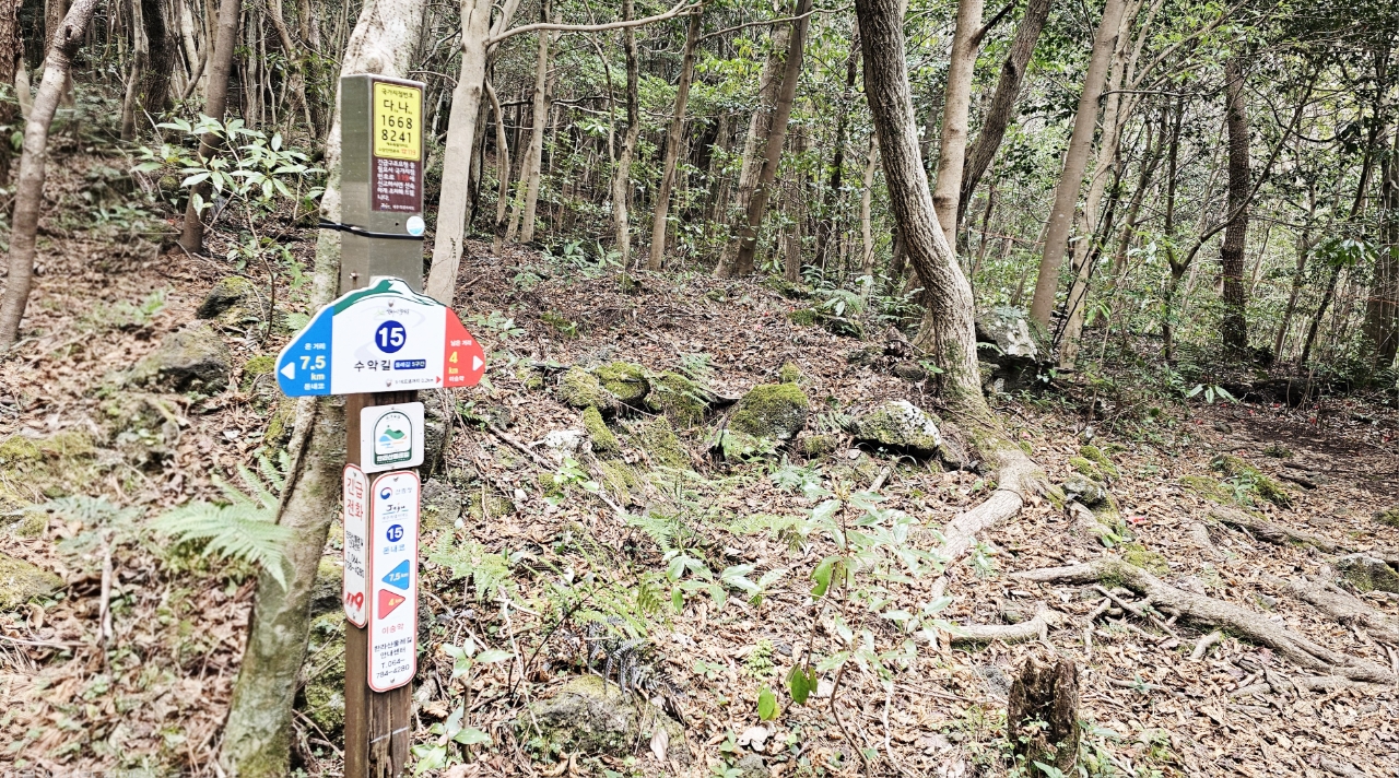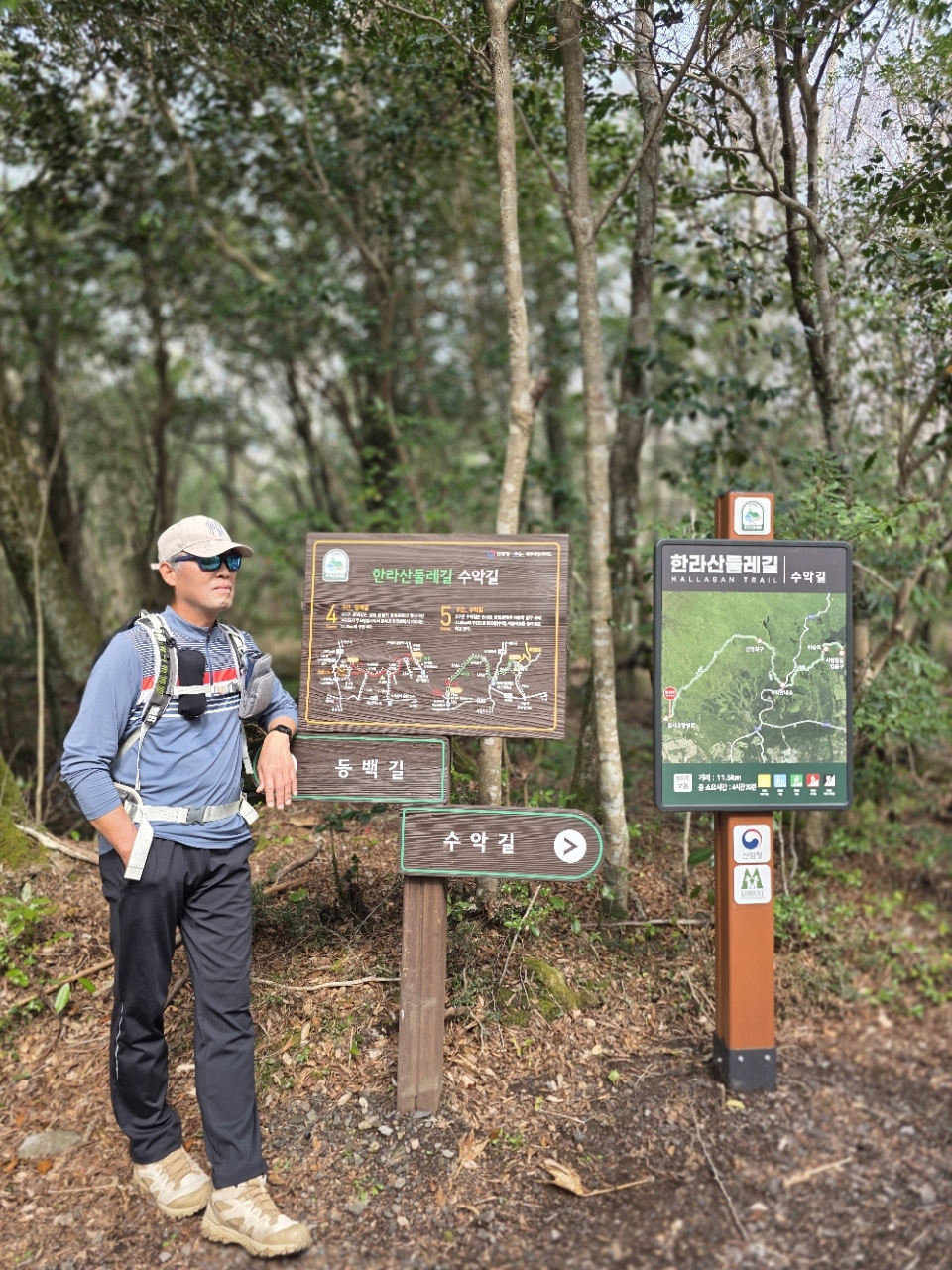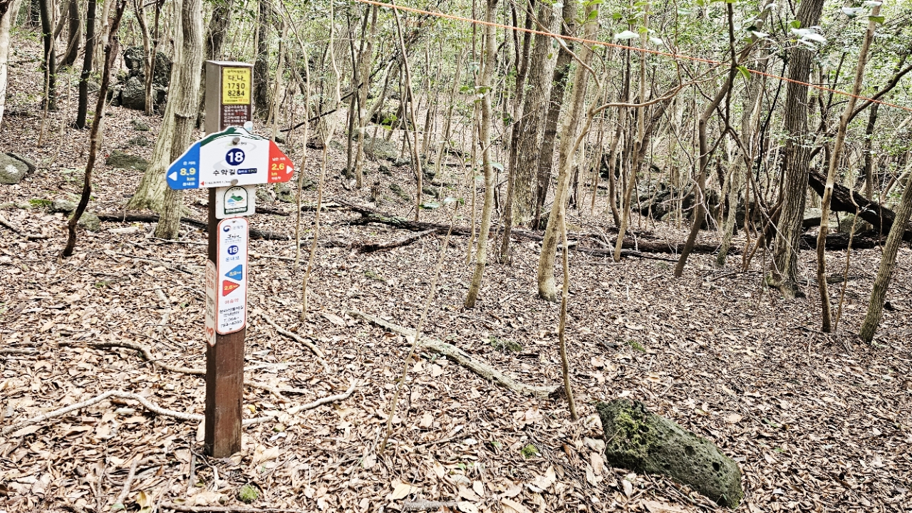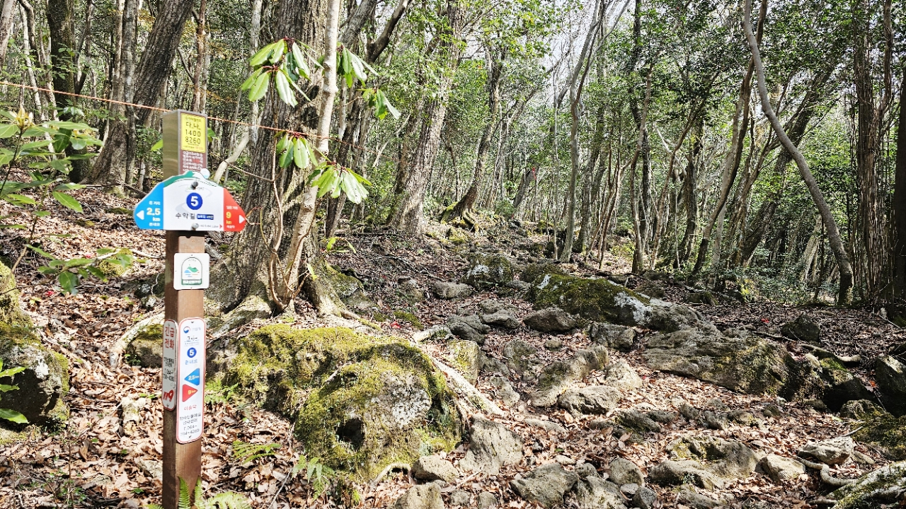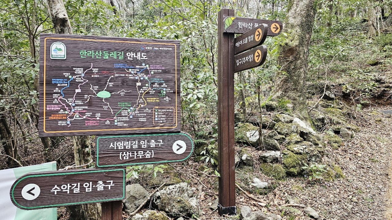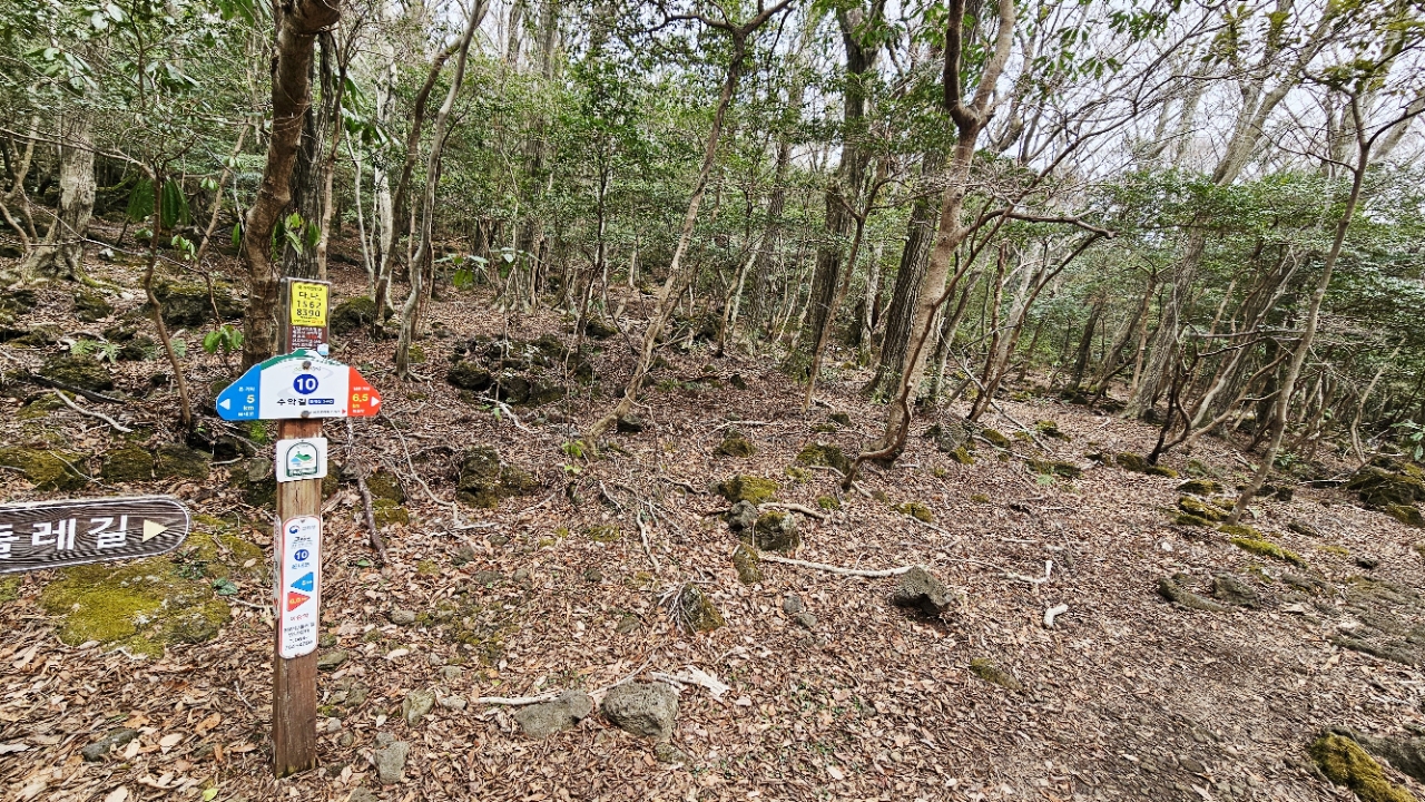 한라산 둘레길 4구간 동백길과의 갈림길이다. 오른쪽이 수악길이다. 수악길의 첫인상은 단연 울창함과 적막함이다. 숲은 깊고 짙으며, 하늘은 나뭇가지 사이로만 드문드문 내려온다. 사람의 말소리보다 바람 소리와 새소리가 더 크게 들린다.