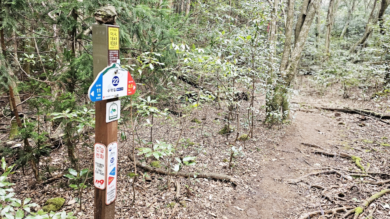 깊은 숲속을 걷는 동안 세상과 잠시 떨어져 있는 듯했는데, 어느 순간 멀리서 차 소리가 들려온다. 그리고 곧 수악길은 5·16도로와 만난다. 숲의 적막에서 현실의 소음으로 넘어오는 순간이다. 도로를 건너기 전에는 이 구간의 마지막 화장실이 있어, 잠시 쉬며 다음 길을 준비하기 좋다.