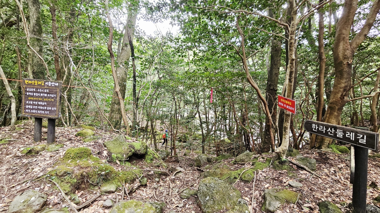 안내소를 지나 핑크색 한라산둘레길 리본을 따라 걷다 보면 갈림길이 나타난다. 왼쪽은 한라산 돈내코 탐방로, 오른쪽은 한라산 둘레길 수악길이다.